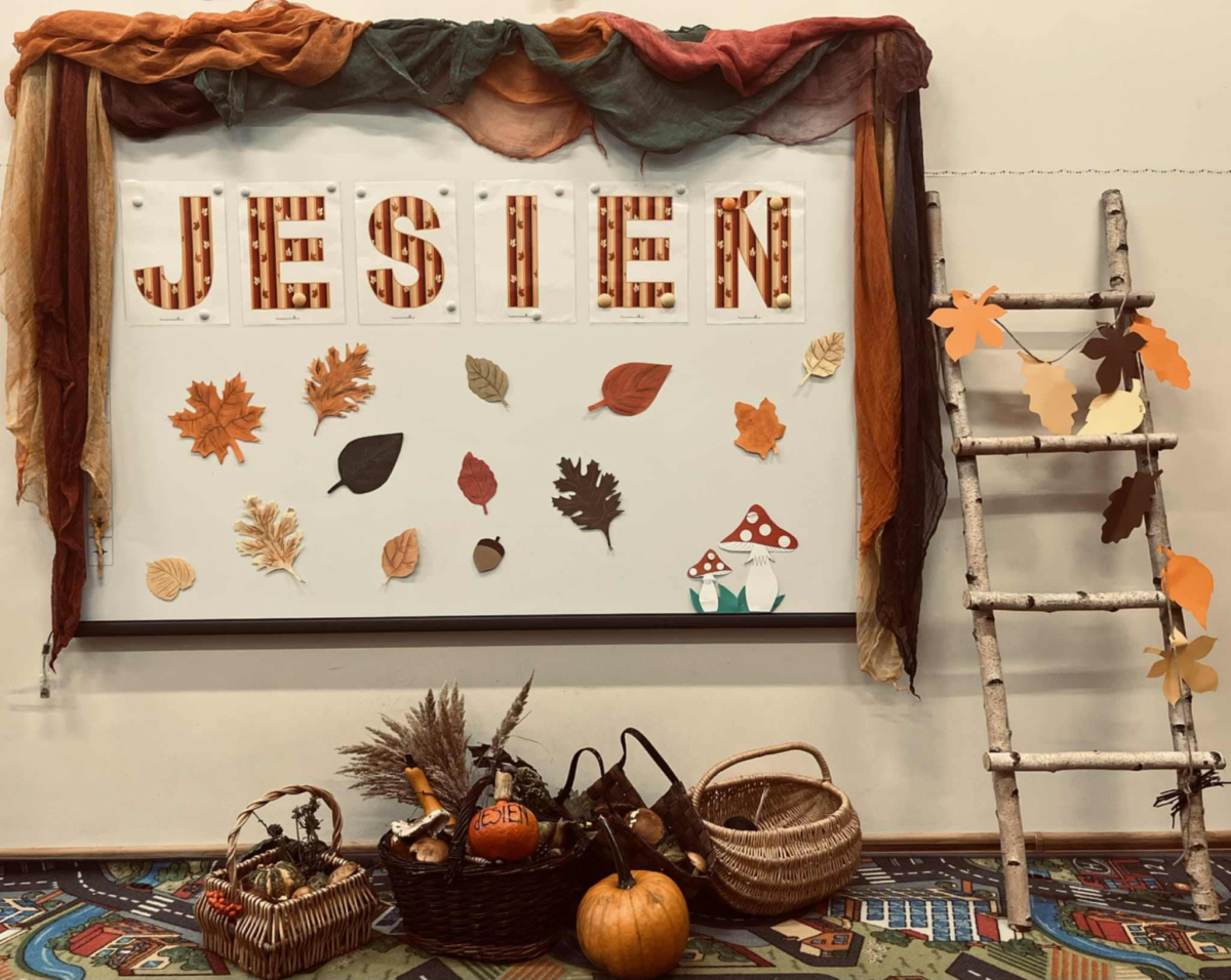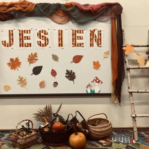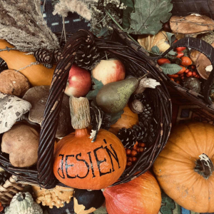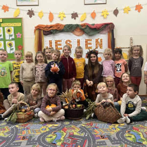 Do naszego przedszkola zawitała Pani Jesień z koszem darów: jabłek , gruszek , orzechów i szyszek .