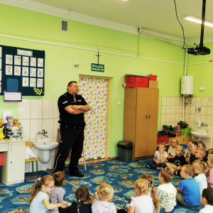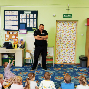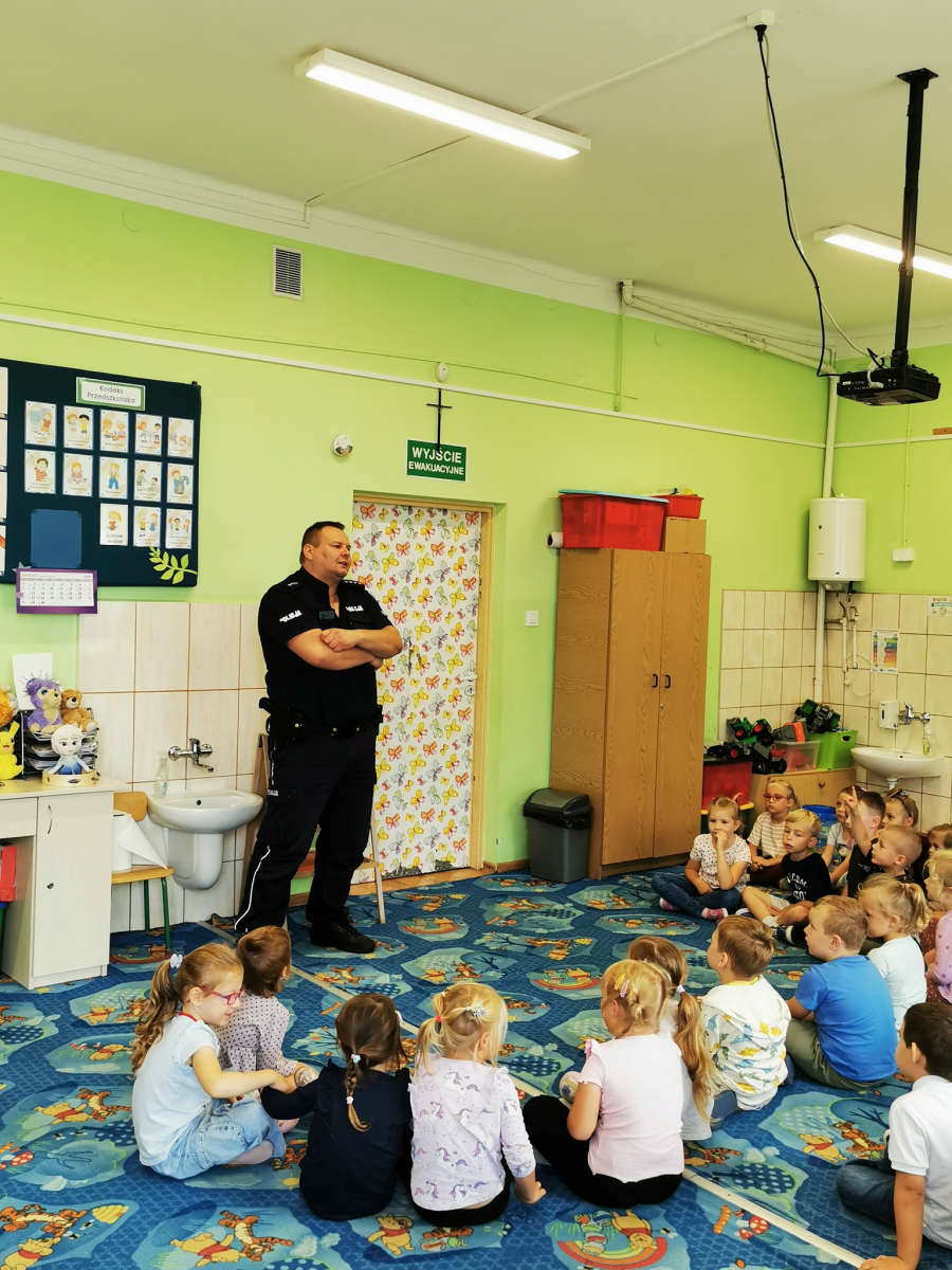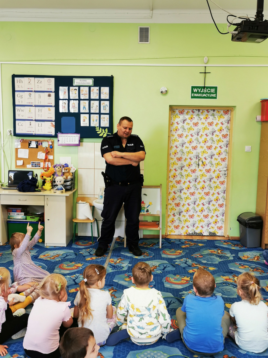 Podczas wizyty opowiedział nam o swojej pracy oraz przypomniał, jak bezpiecznie dotrzeć do przedszkola .
