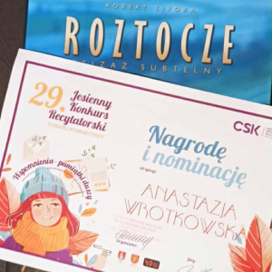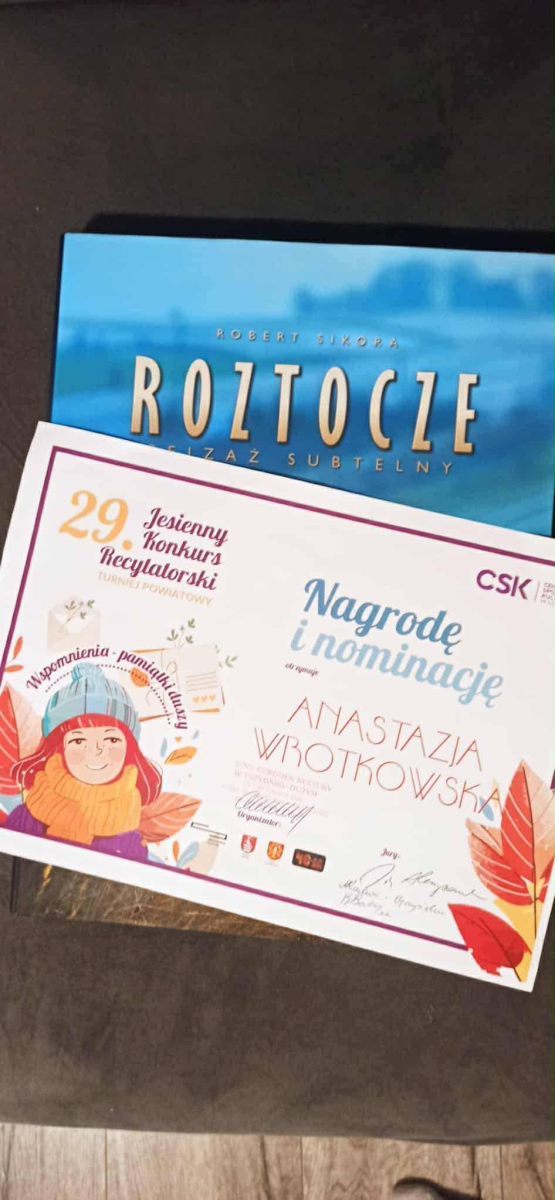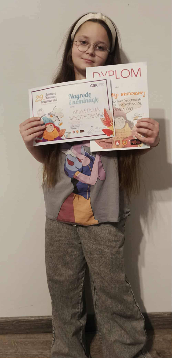 Z radością informujemy, że Anastazja Wrotkowska, uczennica klasy III, będzie reprezentować naszą szkołę podczas etapu WOJEWÓDZKIEGO Jesiennego Konkursu Recytatorskiego „Wspomnienia-pamiątki duszy”.