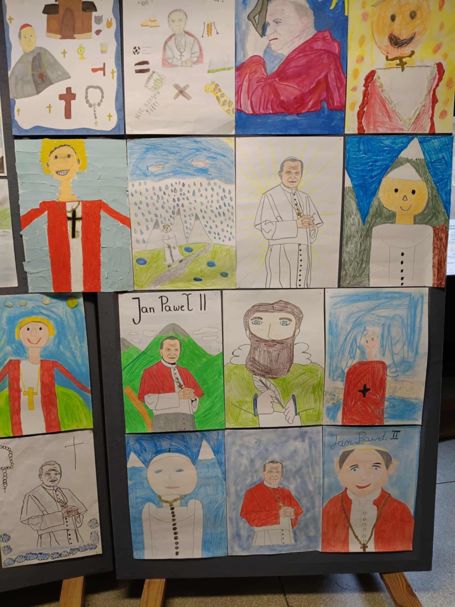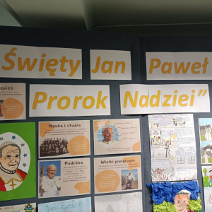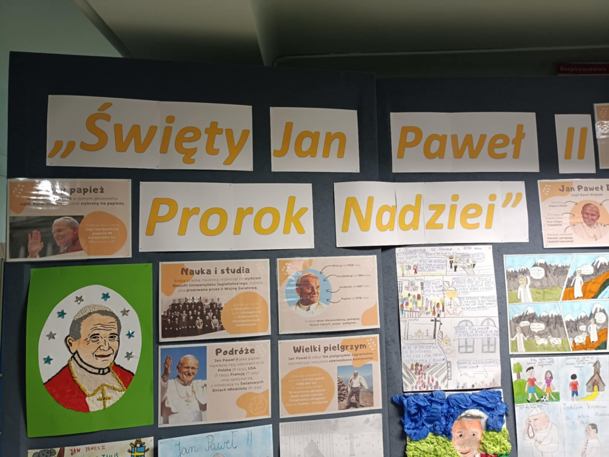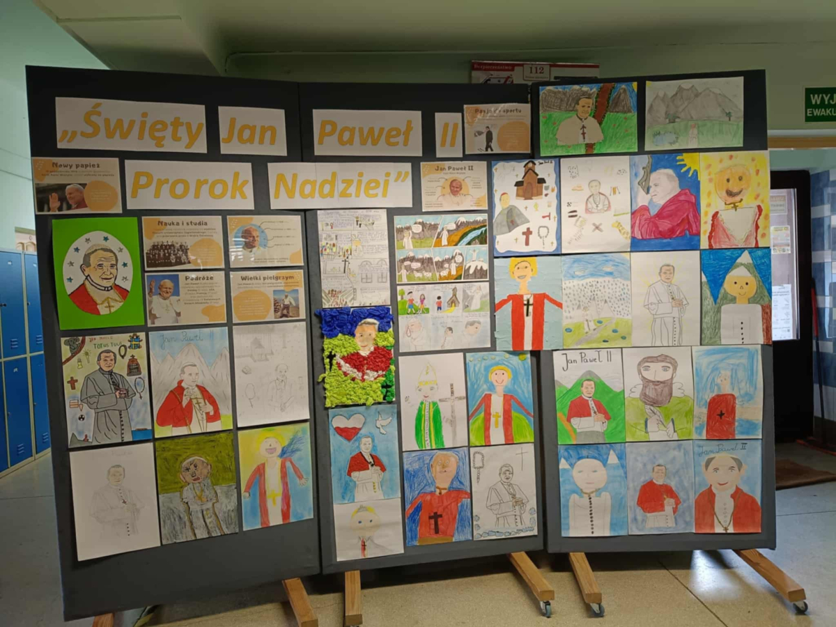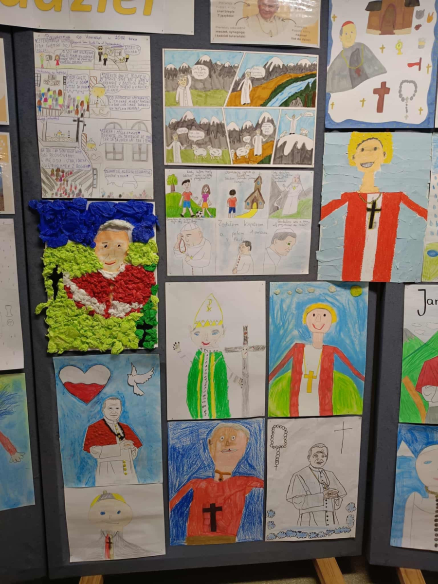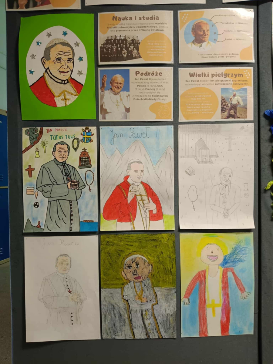 Z tej okazji wykonaliśmy gazetkę ścienną oraz organizowaliśmy konkurs plastyczny poświęcony postaci Papieża Polaka. Uczniowie mieli za zadanie przygotować prace inspirowane życiem i pontyfikatem Jana Pawła II. W konkursie wzięli udział uczniowie z różnych klas, wykazując się pomysłowością i talentem artystycznym.