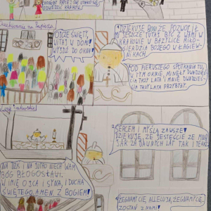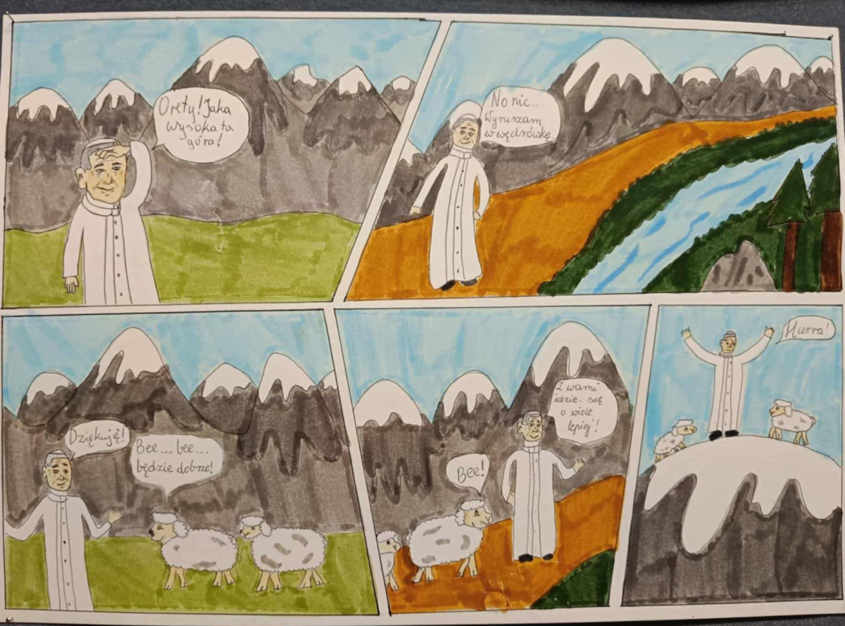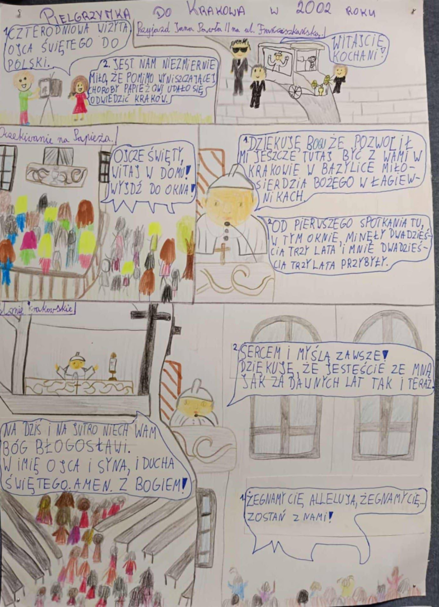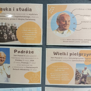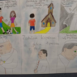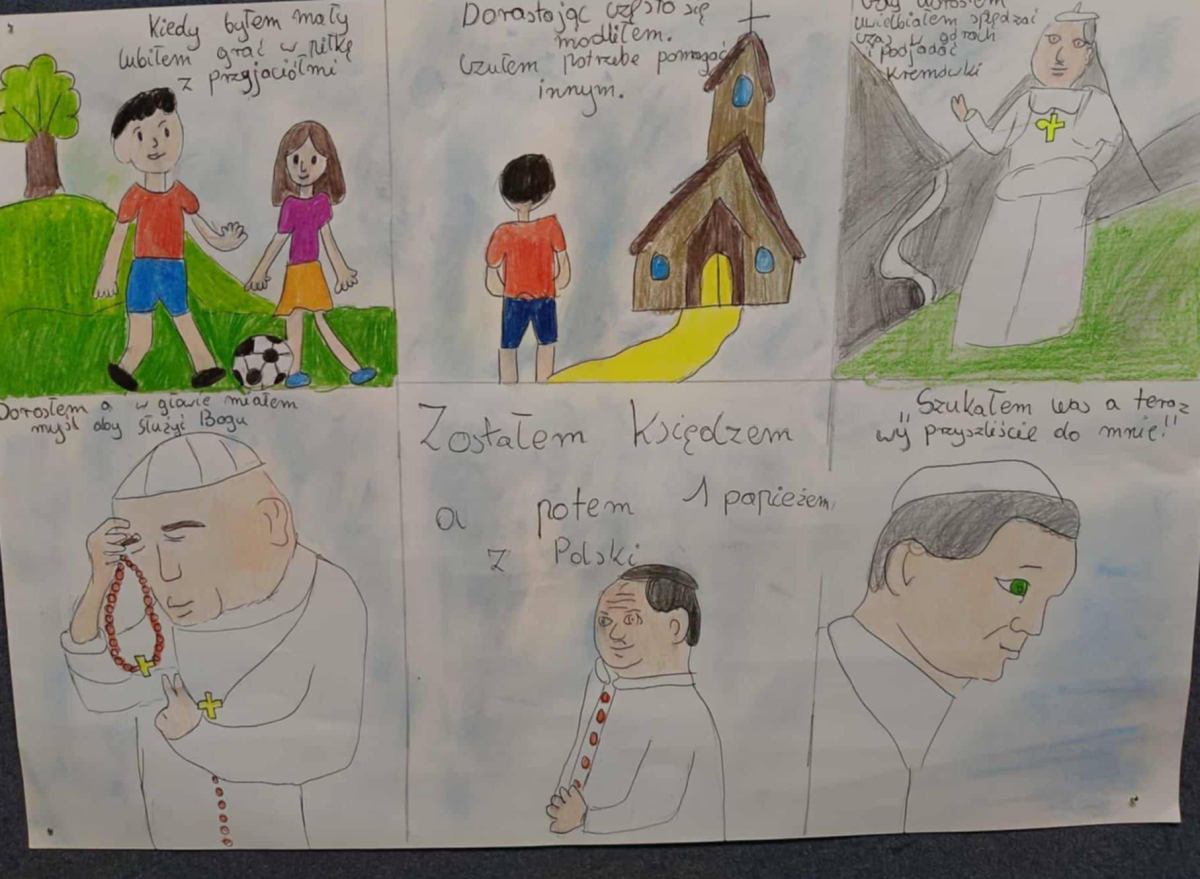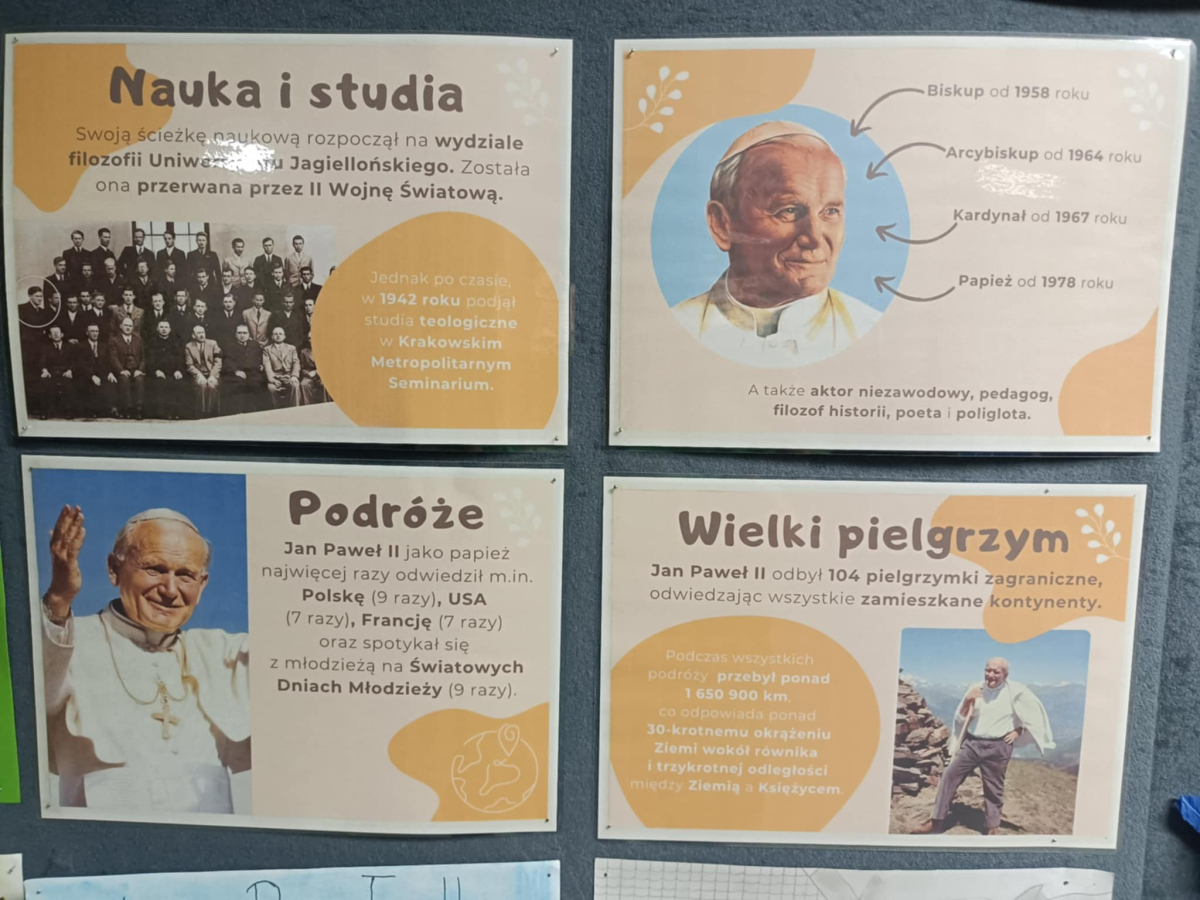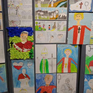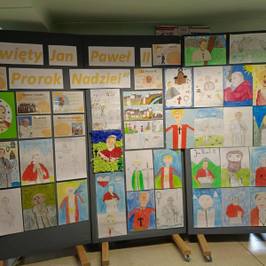 Z tej okazji wykonaliśmy gazetkę ścienną oraz organizowaliśmy konkurs plastyczny poświęcony postaci Papieża Polaka. Uczniowie mieli za zadanie przygotować prace inspirowane życiem i pontyfikatem Jana Pawła II. W konkursie wzięli udział uczniowie z różnych klas, wykazując się pomysłowością i talentem artystycznym.