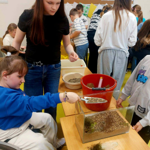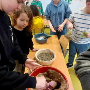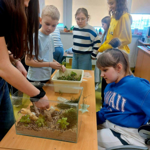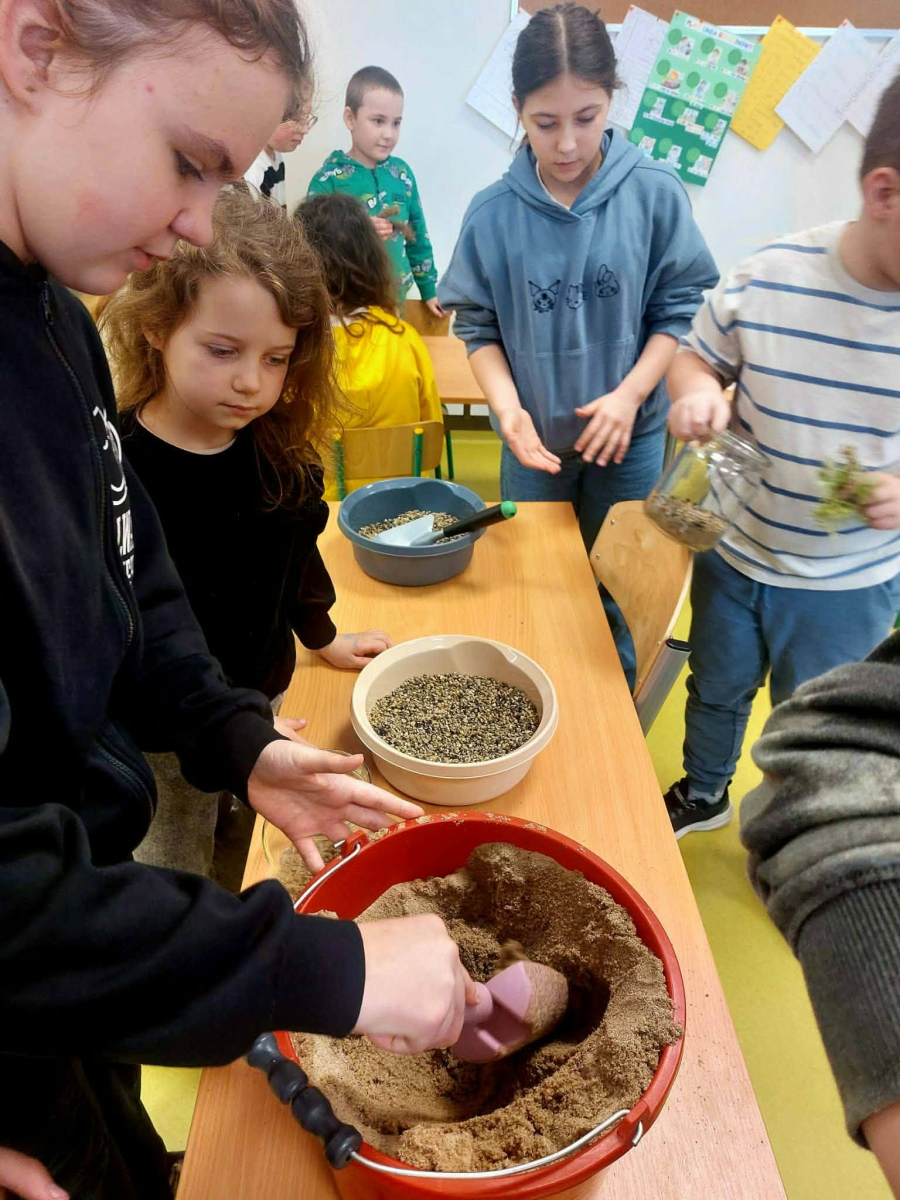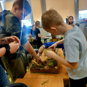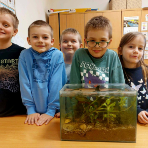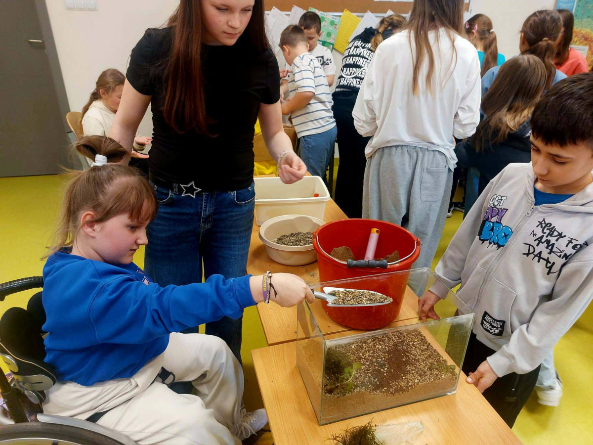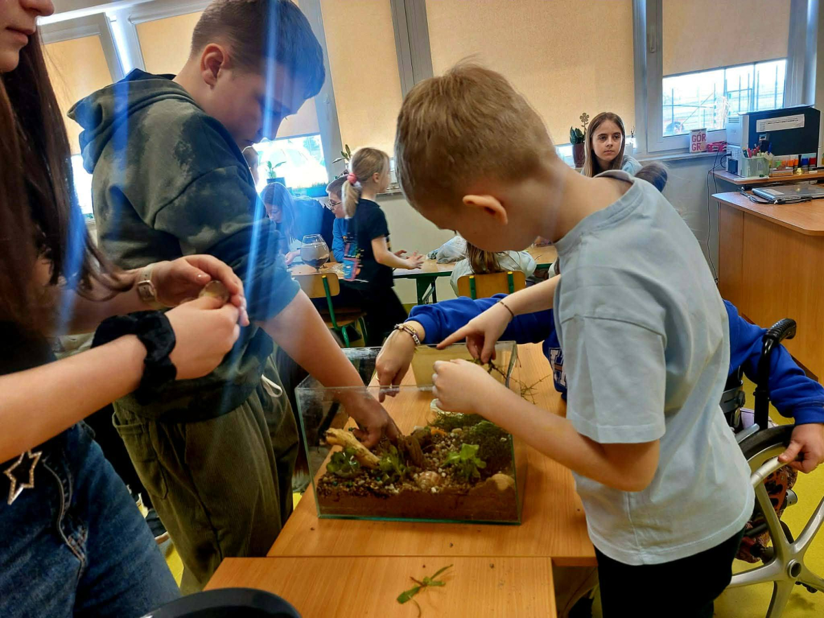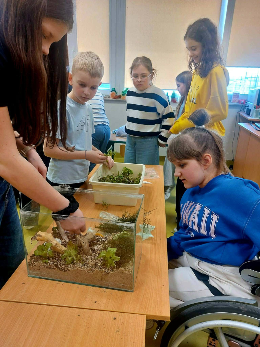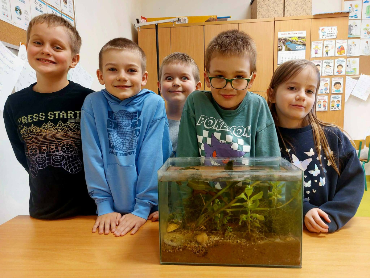 Mała oaza życia i nauki! Uczniowie klasy I, wspierani przez starszych kolegów z klas IV i V, stworzyli akwarium w starym szkle w ramach Alertu Ekologiczno-Zdrowotnego.